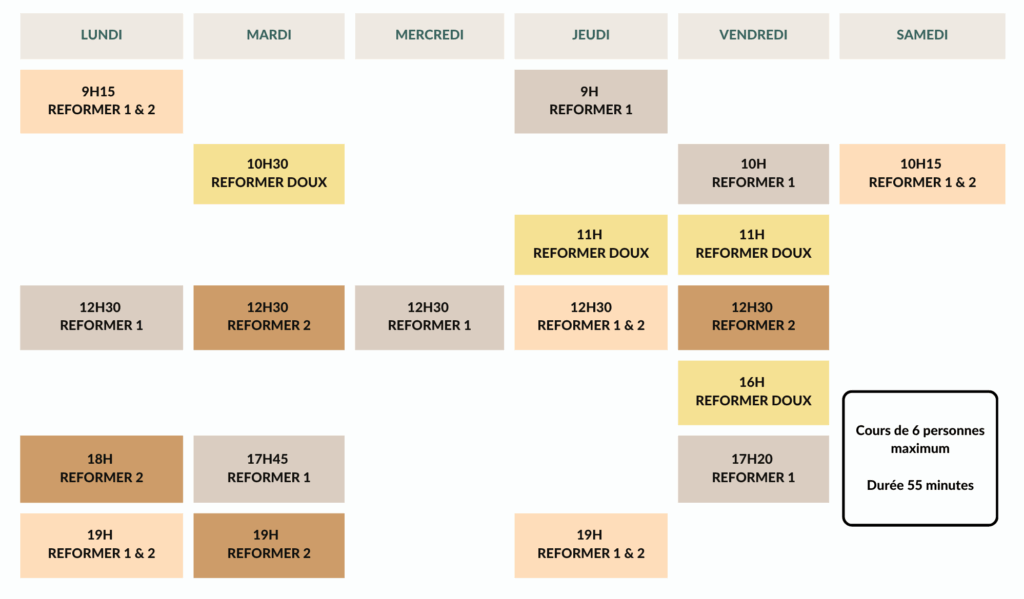 Planning des cours Pilates – Cours collectifs Pilates – Pilat’ training – Mobility flow – Ball&Balance Réserver un cours Voir les tarifs Pilates Reformer – Cours collectifs Découvrir le Pilates Reformer Réserver un cours Voir les tarifs